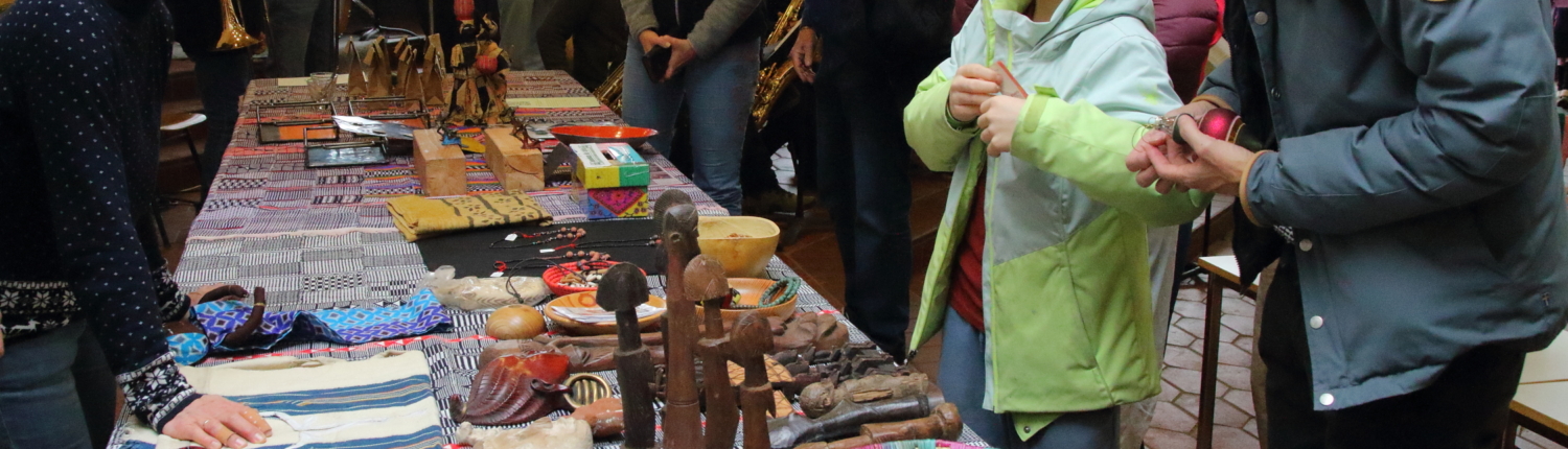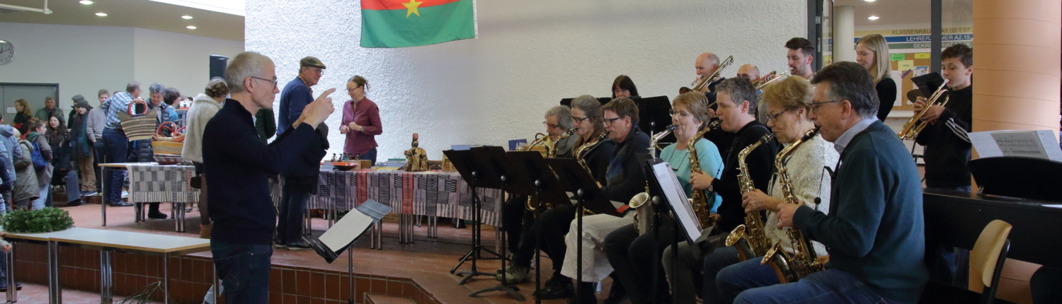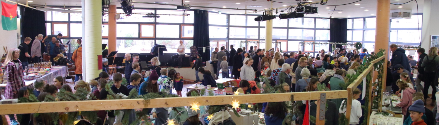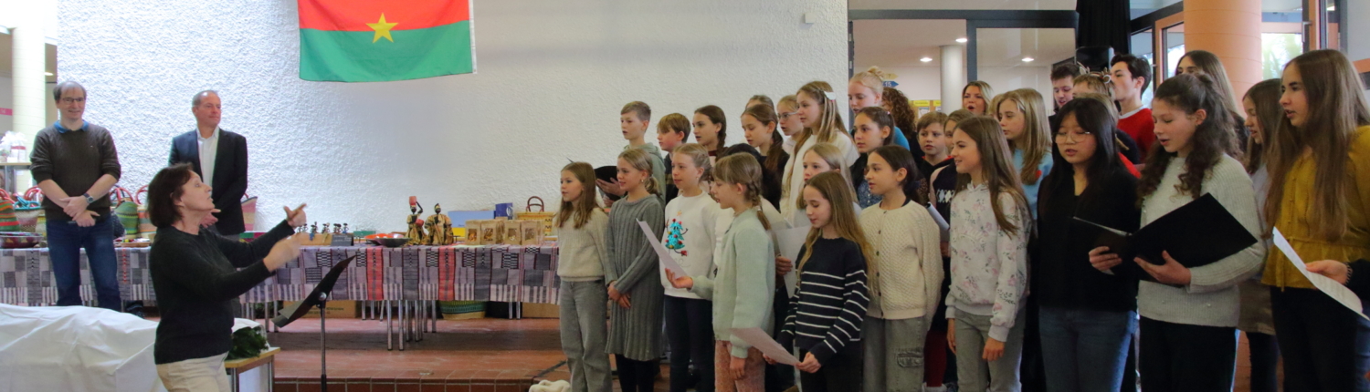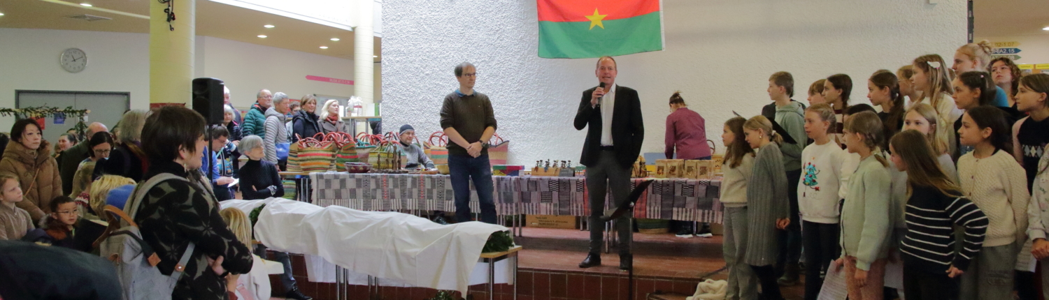 Schon am Vormittag herrschte in der Aula geschäftiges Gewusel: Überall wurden Verkaufsstände dekoriert, aus der Waffel- und Crêpes-Ecke strömte verführerischer Duft und das Buffet füllte sich zusehends mit Köstlichkeiten. Nach und nach kamen immer mehr Besucherinnen und Besucher, gespannt auf die Eröffnung unseres besonderen Weihnachtsbasars – diesmal anlässlich des 30-jährigen Bestehens unseres Vereins „Gemeinsam für Afrika – eine Schule hilft Schülern in Burkina Faso“.