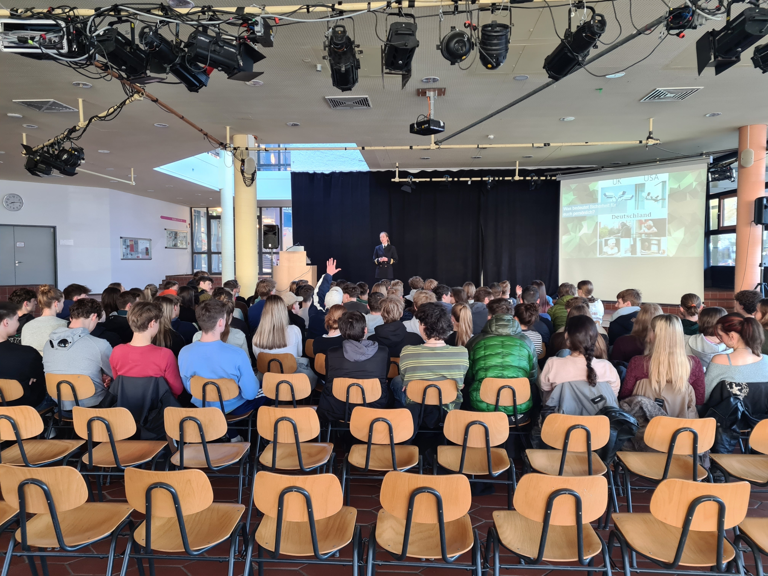 Daher fand am 20.03.26 für die Schülerinnen und Schüler der Q12 ein Vortrag zum Thema „Außen- und Sicherheitspolitik“ statt. Zusammen mit einer Expertin für Außen- und Sicherheitspolitik, der Jugendoffizierin Frau Kapitänleutnant Madeleine Gerweck, diskutierten unsere Schülerinnen und Schüler 90 Minuten über die Themen „Außen- und Sicherheitspolitik, die Rolle der Bundeswehr und der BRD in internationalen Gremien wie der NATO und der UNO“, sowie über generelle aktuelle Bedrohungs- und Konfliktszenarien und welche Rolle die Politik bei deren Lösung spielt.
