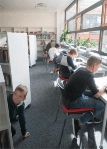 - Endlich Ruhe! Während der Oberstufenraum manchmal eher an einen überfüllten Club erinnert, bietet die Bibliothek angenehme Arbeitsplätze für Oberstufenschüler:innen, die wirklich etwas schaffen wollen.